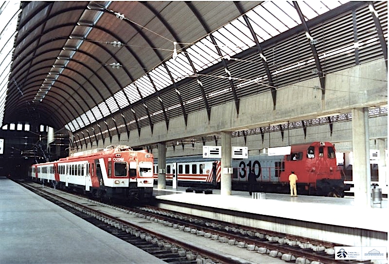 | En 1992 las 440 de Cercanías trabajaban también en Sevilla. Aquí aparece una de ellas en la estación de Santa Justa junto a una 310 y un coche de viajeros con la librea de Regionales (AHF/MFM. Autor: Justo Arenillas) |