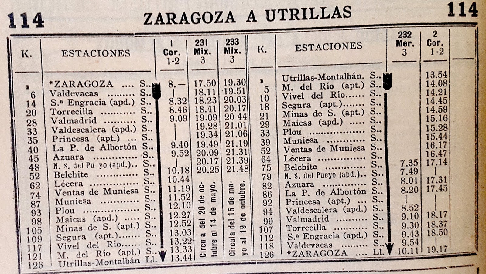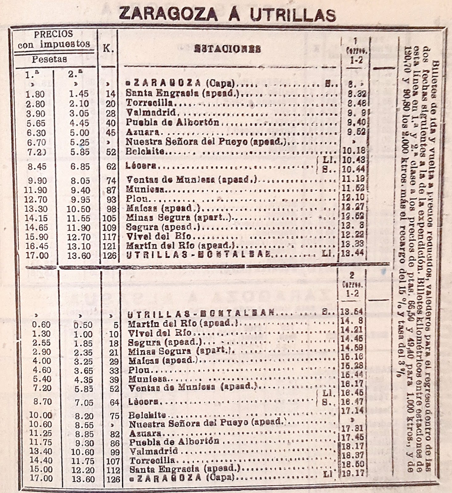 | Horarios -y precios- en diciembre de 1939. El correo ascendente llegaba a Utrillas a las 13,44 horas y diez minutos después volvía hacia Zaragoza. |