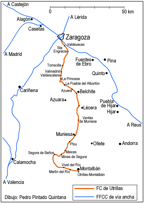 | Recorrido del Ferrocarril de Utrillas a Zaragoza (Dibujo de Pedro Pintado) |