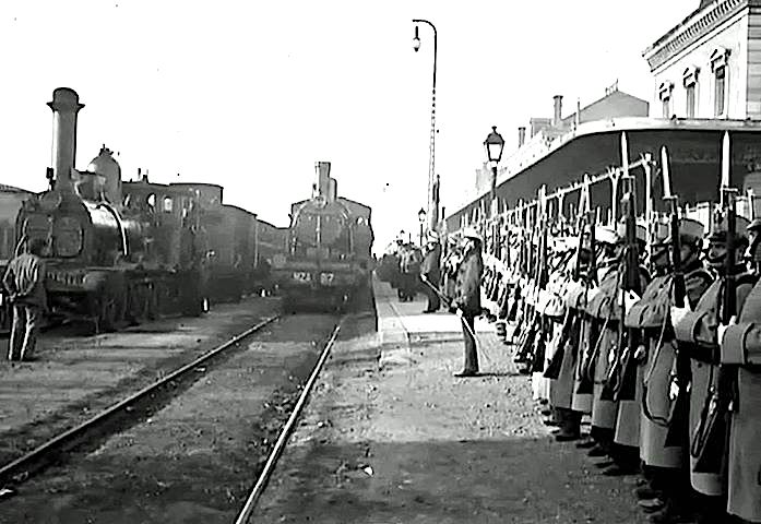| Otra curiosa imagen. La MZA 817 aparece casi como protagonista de la despedida que se rendía a un ministro en la estación de Zaragoza en el año 1912. La locomotora de la izquierda pertenece probablemente al grupo -ya entonces bastante antiguo- de las 246 a 316 de MZA construidas a mediados de los años cincuenta del siglo XIX por las factorías Kitson, Wilson o Cail (foto: autor desconocido/cortesía J.A. Méndez Marcos) |