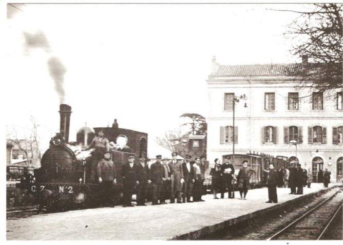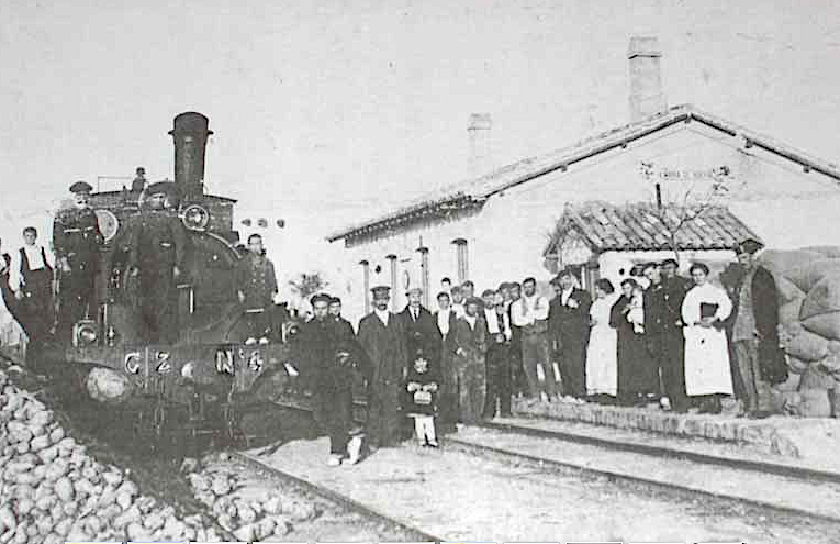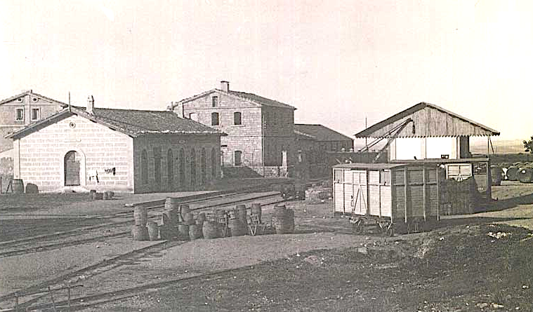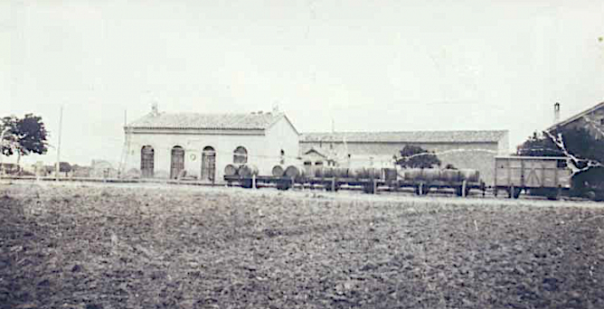 | Estación de Cariñena. Se encontraba algo apartada de la población para dar mejor servicio a las bodegas (Foto: autor desconocido/Centro de Interpretación del Ferrocarril de la Comarca del Campo de Cariñena (CIFCCC)) |