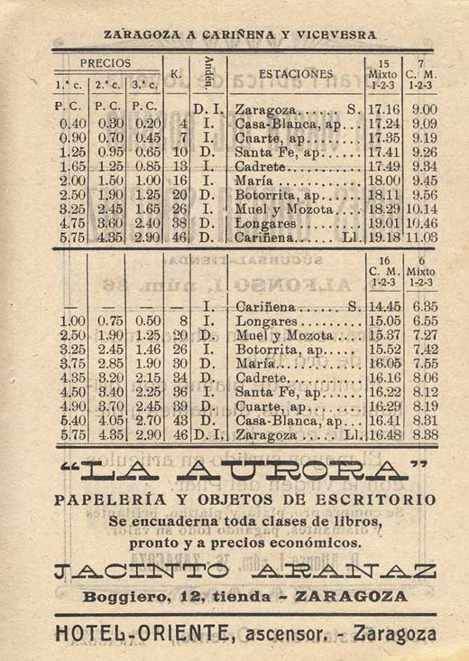 Tras visitar la línea minera de Utrillas a Zaragoza, y si seguimos remontando un poco más el Valle del Ebro. nos encontramos con otro ferrocarril de ancho métrico de no muy larga existencia y que, además, fue uno de los más tempranamente clausurados. Sin embargo, y de forma distinta a otras ocasiones, su supresión no fue debida a motivos económicos o de competitividad, aunque los tuvo, sino a sus sustitución por un ferrocarril de ancho ibérico. Me estoy refiriendo al ferrocarril de Cariñena a Zaragoza.