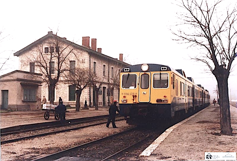| Un 592 detenido en una estación de la línea de Valladolid a Ariza, probablemente Peñafiel, en diciembre de 1984, pocos días antes de que fuera clausurada (AHF/MFM. Autor: Alberto García Álvarez) |