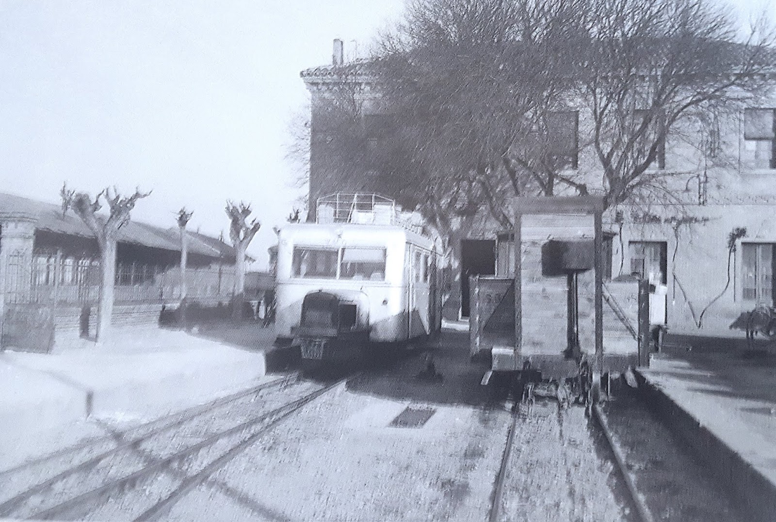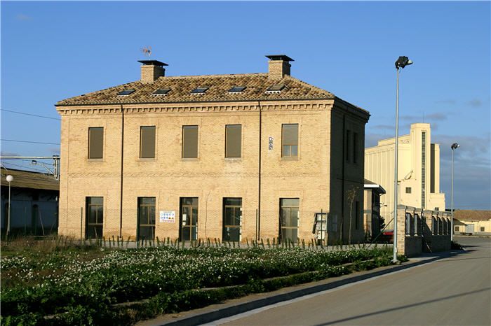 | Antigua estación del Ferrocarril de las Cinco Villas en Gallur, hoy convertida en albergue municipal. La playa de vías estaba situada en la zona que hoy ocupa la vegetación (Foto: autor desconocido) |
