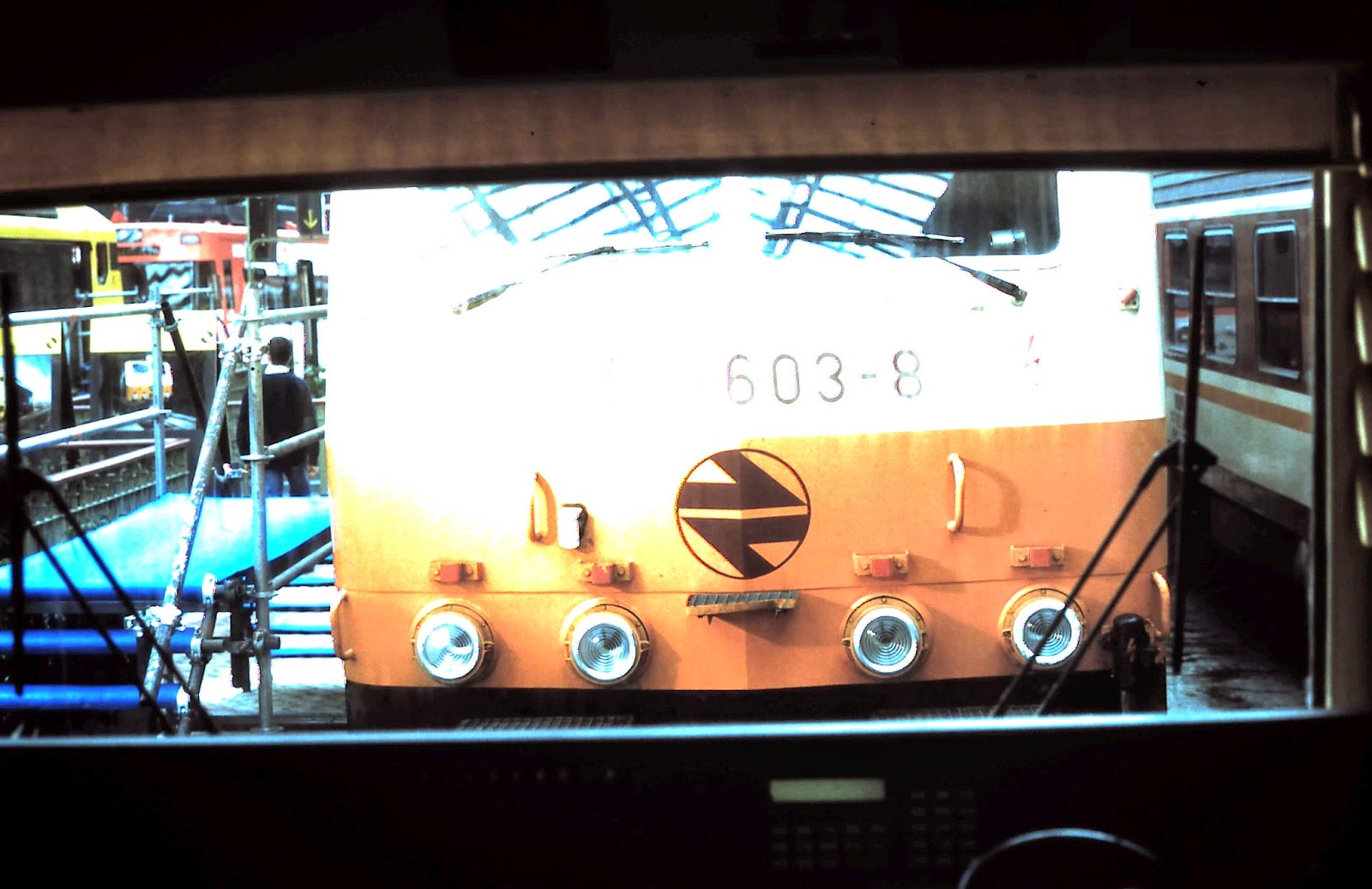 | El frontal de la 603 desde la cabina de un electrotrén 444-500. Estación de Príncipe Pío, Madrid. 1989 |