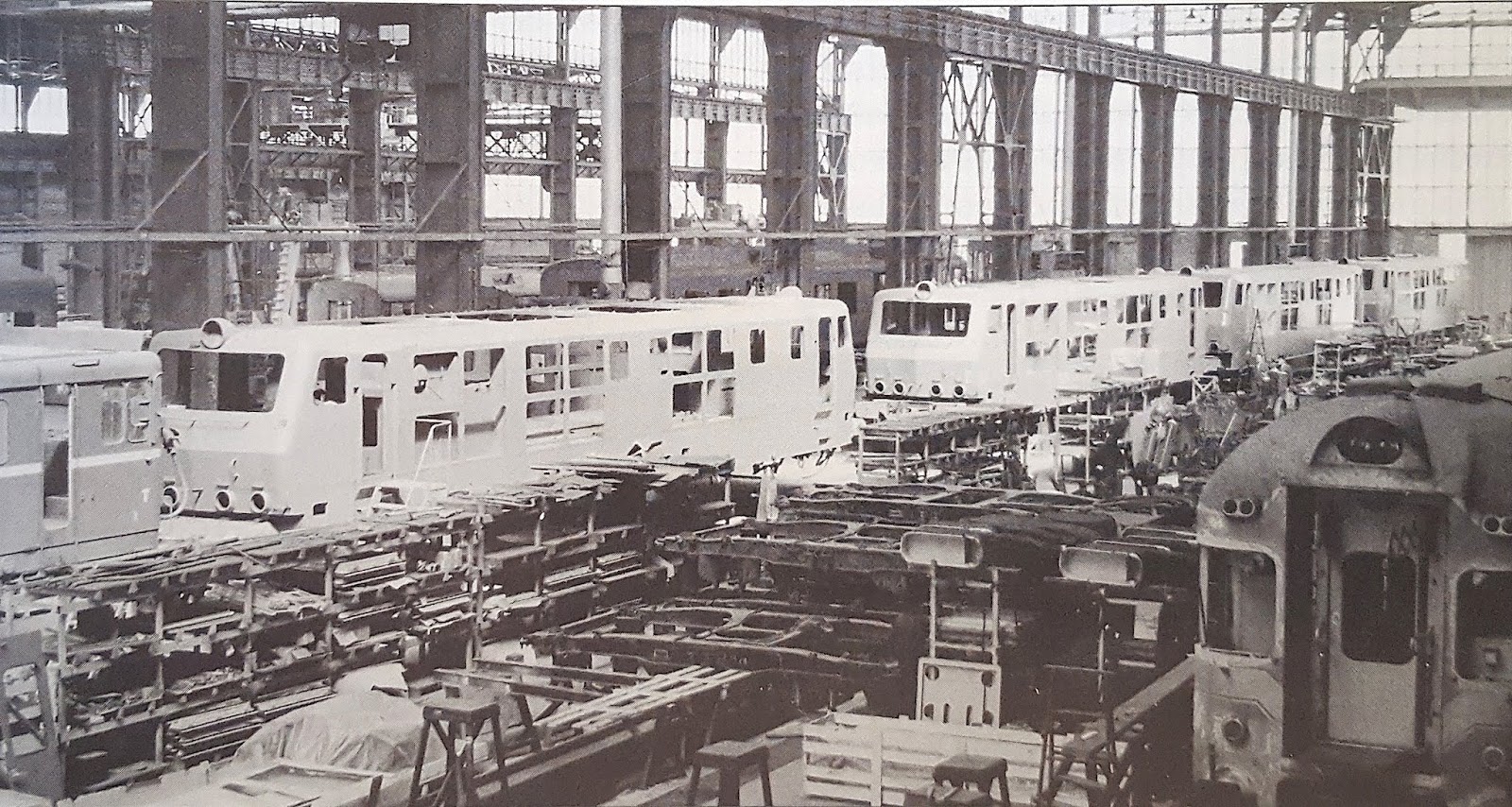 | Montaje de cajas de las 250 en las instalaciones de CAF en mayo de 1982 (foto: CAF) |
