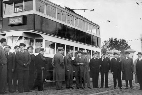 Inauguración del primer trolebús de Barcelona. Los vehículos utilizados eran antiguos autobuses reconvertidos para el nuevo servicio. Fondo de César Ariño Planchería