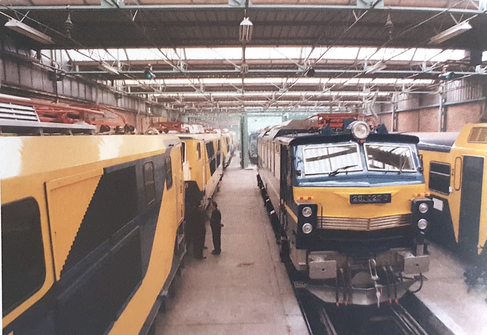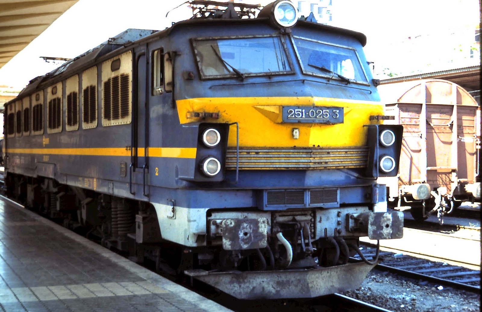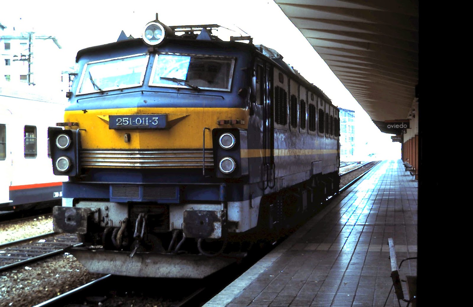 En la entrada dedicada a las "alemanas" de la serie 250, me referí al concurso convocado por RENFE a mediados de los 70 para la disposición de un conjunto de locomotoras de gran potencia, y comenté cómo fue resuelto mediante la compra de una serie de locomotoras alemanas -las 250- y otra de locomotoras japonesas, la 251. La solución alemana basada en bogies monomotores y birreductores de tres ejes era muy compleja y tuvo problemas ya desde su puesta a punto. Sin embargo, la japonesa basada en la amplia experiencia de bogies de dos ejes utilizados en todas las series 279, 289 y 269 y con equipos electrónicos de potencia, destacó claramente desde el principio por su eficacia y rendimiento. Además, la posible dificultad que podía provenir de un rodaje de tres bogies fue perfectamente solventada gracias a un buen diseño funcional del bogie central. De algún modo se puede considerar que las 251 fueron una evolución lógica de las 269 hacia mayores pesos y potencias llegándose incluso a decir que una 251 era una "269 y media". En concreto, su gran peso de 138 toneladas le brindaba una cierta ventaja a las 250 en adherencia y esfuerzo de tracción, si bien, a velocidad máxima, el esfuerzo de tracción de las 250 era mayor. Quizás todo ello llevó a que, si bien en principio, se había pensado en asignar la serie 250 a la línea Gijón-León, fuera al final la 251 la elegida.