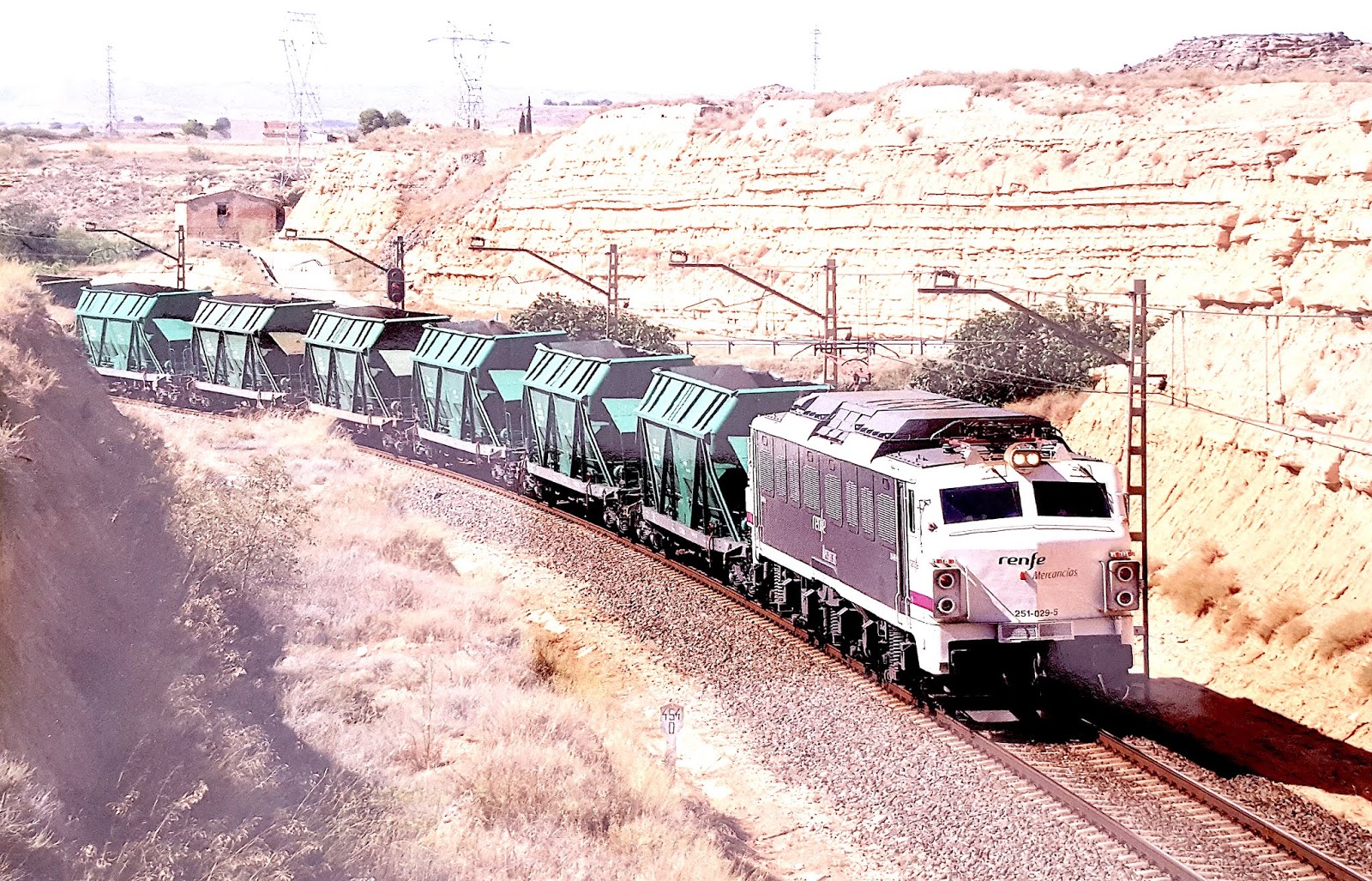 | La 251-029 en cabeza de un carbonero saliendo de Caspe en agosto de 2018, cumpliendo el cometido en el que han relevado a las 269 (foto: Eduard Ramírez/CARRIL) |
