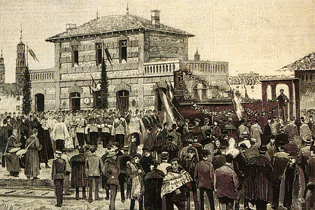 | Inauguración en la estación de Tarazona (litografía de La Ilustración Española e Iberoamericana) |