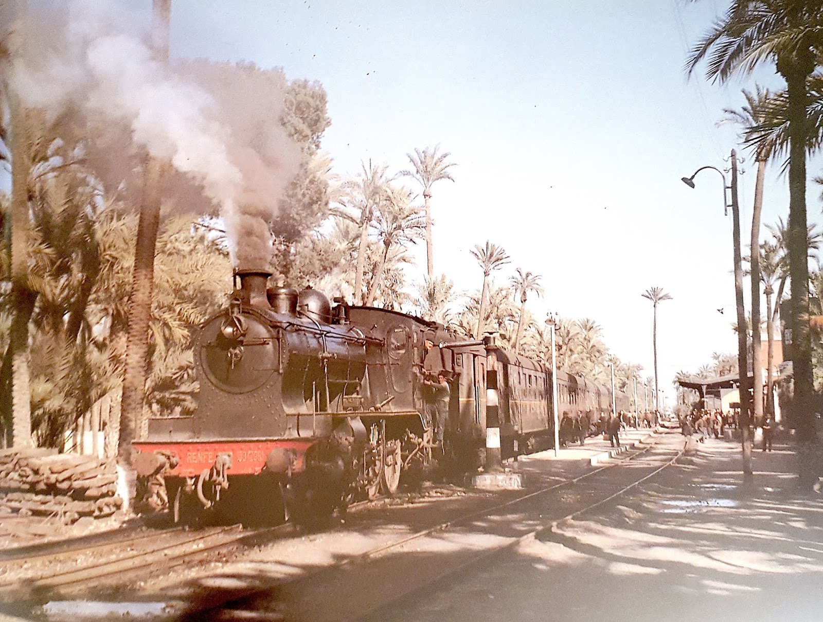 Marc Dahlström tomó esta bella imagen de la 130-2081 con su tren en la estación de Elche, junto al palmeral en febrero de 1965