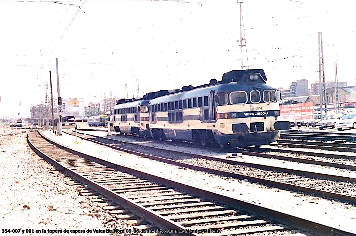 | Otra imagen del mismo tren encabezado en este caso por la 354-007. Julio de 1993 (foto: J. A. Méndez Marcos) |
