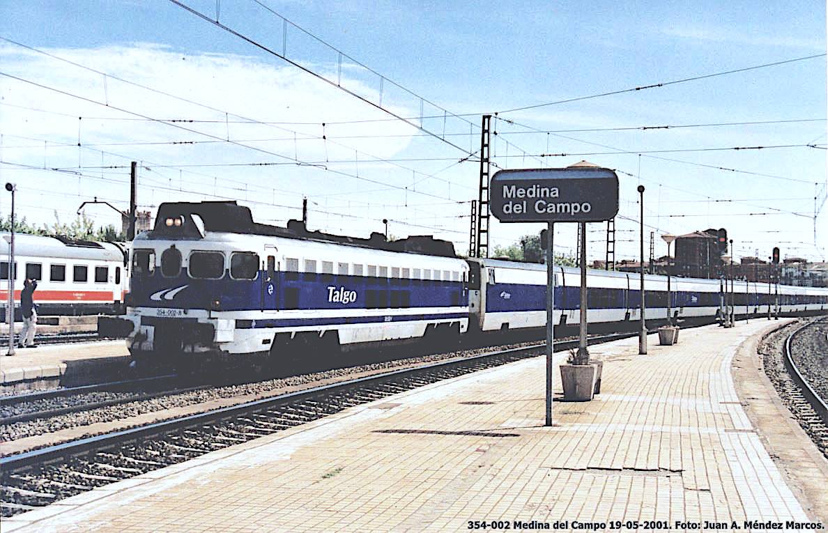 | La majestuosa imagen de la 354-002 con su pendular en Medina del Campo en mayo de 2001 (foto: J. A. Méndez Marcos) |