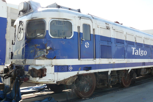 Una verdadera pena este final de la serie 354 y, a la vez, de la gran saga de las "vírgenes" de Talgo. Como ya he dicho en alguna ocasión creo que Patentes Talgo debería, como justo homenaje a las locomotoras que fueron los "buques insignias" de su marca, poner en funcionamiento alguna o algunas de estas locomotoras junto con alguna composición Talgo. Nos quedan por ahora -y toco madera- las 350-002 y 350-003 (Aránzazu y Begoña del Talgo II), la 352-009 (Virgen de Gracia del Talgo III), 353-005 (Virgen de la Bien Aparecida también del Talgo III) y 354-001 (Virgen de Covadonga del Talgo pendular). ¿No sería lo lógico, lo elegante y lo educativo crear un "santuario" para estas "vírgenes"? Su casa madre tiene la palabra y la decisión.