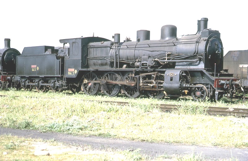 | La 140-2438, 4883 de Norte, recibió una caldera tipo Reggiani-Crosti como experimento para una mejor utilización de los gases de escape favoreciendo el trabajo del vapor recalentado. La modificación no se extendió a más locomotoras. Peter Gray la fotografió en Valladolid en mayo de 1965. |