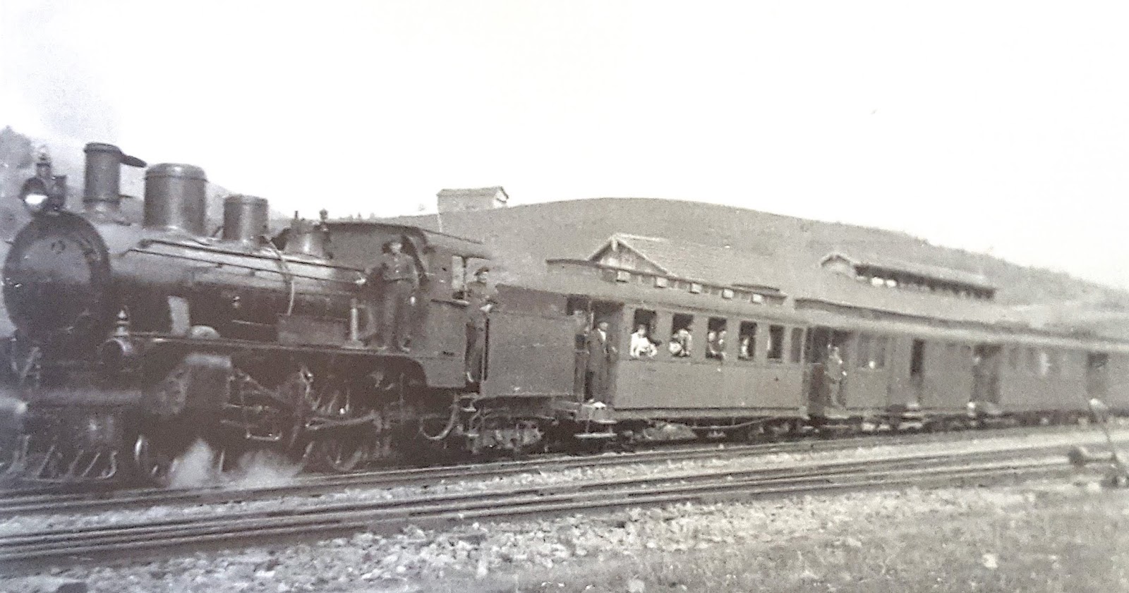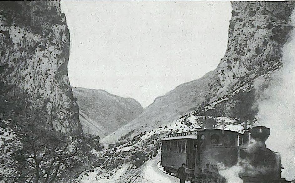 | Bajo la Peña de Dos Hermanas está detenido un pequeño convoy formado por la 020T (probablemente) con un coche de viajeros (foto: autor desconocido) |