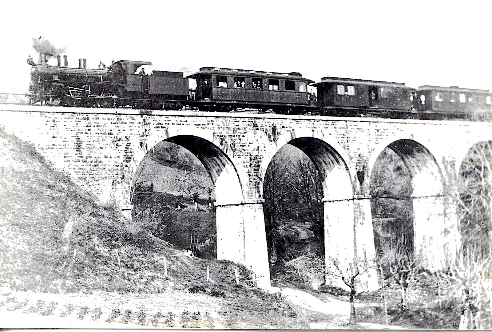 | Tren de viajeros sobre un viaducto cercano a Lasarte (foto: Euskotren/Museo Vasco del Ferrocarril) |