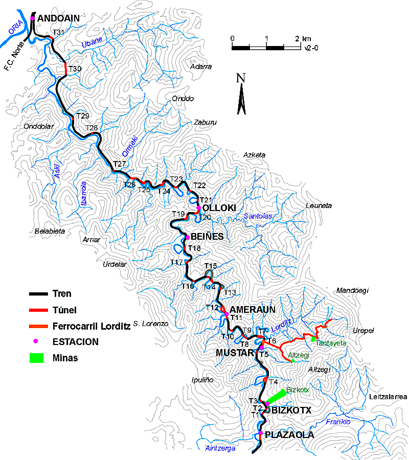 | El recorrido del primitivo ferrocarril minero entre las minas de Plazaola y la localidad de Andoain por el valle de Leizarán (fuente: www.leitzaran.net) |