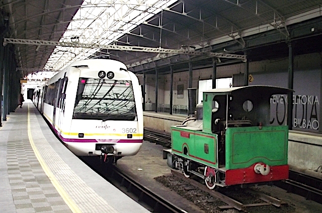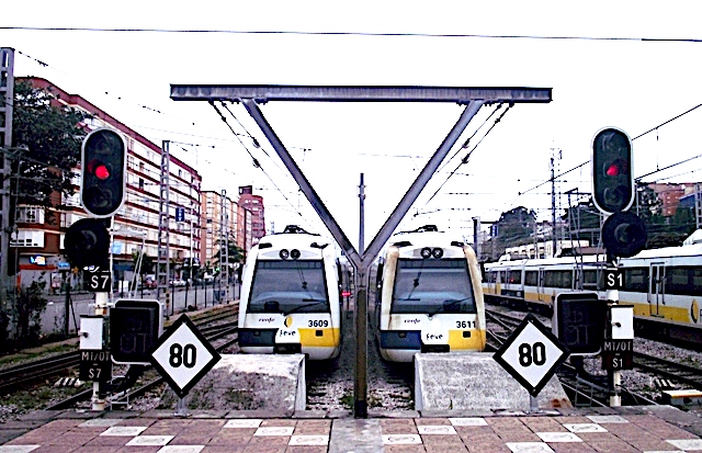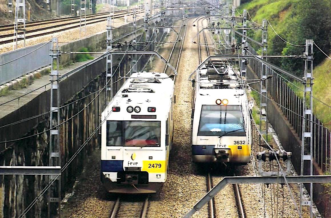 La 3607-3608 en Bilbao junto al Apolo 2421-2471, ambos con la librea de RENFE-Ancho Métrico (RAM) (foto: Aitorfernan)