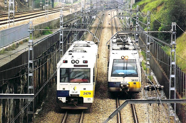 La 3617-3618 junto a la "ikea" 2711-2712 en Bilbao. El cambio de librea a la "nueva" blanca, azul y amarilla, se llevó a cabo hacia 2005-2006 (foto: Jonathan Gómez) |