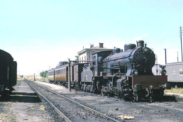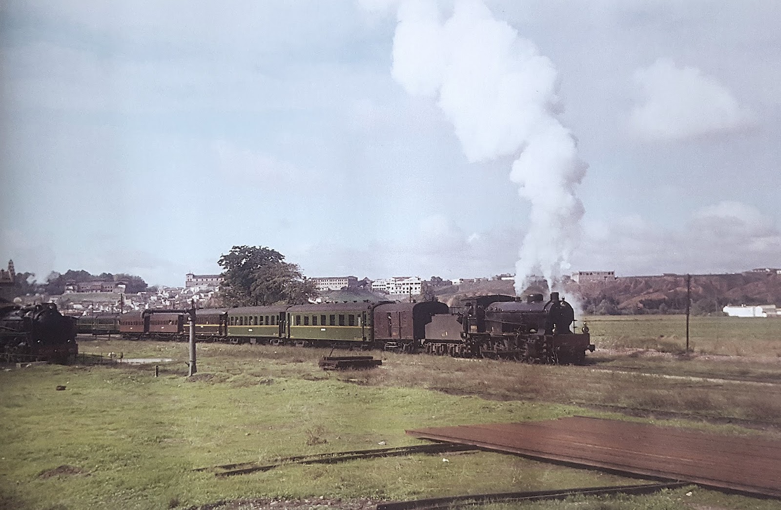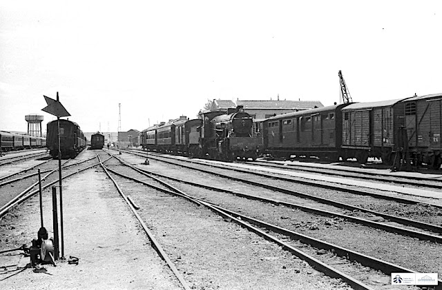 | En esta magnífica fotografía de Harald Navé tomada en el verano de 1962, una Linke encabeza un tren de viajeros abandonando la estación de Toledo hacia Madrid, seguramente vía Villaseca y Parla. Me resulta llamativo el gran número de coches que arrastraba ya que solía encabezar composiciones con dos o tres coches de caja de madera; quizás podría tratarse de alguna composición especial o de coches metálicos añadidos por algún motivo. Tras este tren aparecen algunos coches de viajeros que debían pertenecer al ómnibus Toledo-Aranjuez-Madrid ("El Turista") que salía cerca de las siete de la tarde encabezado presumiblemente por la Mikado que asoma por el borde derecho de la imagen situada sobre la placa giratoria y que le habría traído por la mañana desde Madrid. |