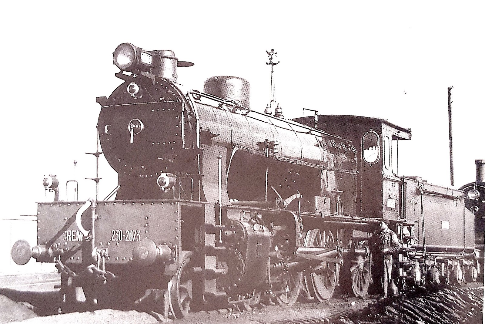 Tres años después, Lawrence Marshall fotografió a la 230-2073 en el depósito de Delicias. Se aprecia con toda claridad el detalle que siempre me llamó la atención de estas Linke: su ancha traviesa frontal.