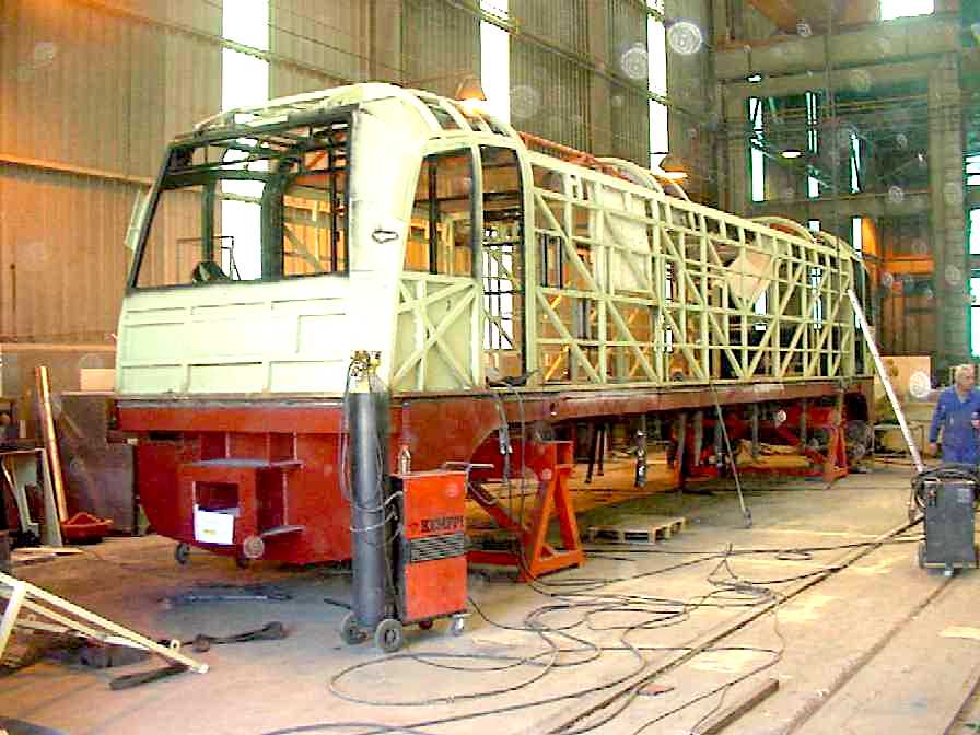 | Una 1900 en proceso de fabricación. El esqueleto de la caja se va montando sobre el bastidor. Salvo en el caso de la 1901 para la que se aprovechó el de la Alsthom 1025, fueron todos de nueva construcción (foto: Ramón Capín) |