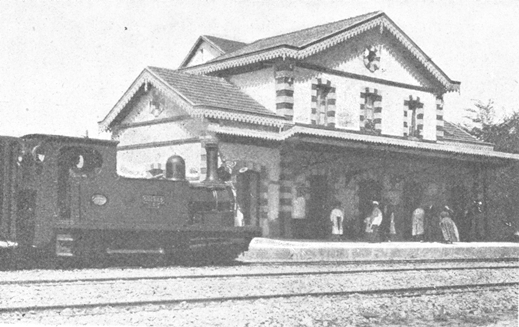 | Una de las primitivas locomotoras en la estación de Plencia a principios del siglo XX (foto: archivo Euskotren/Museo Vasco del Ferrocarril) |