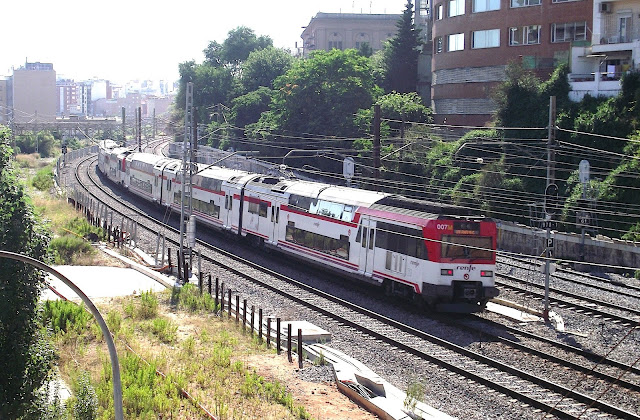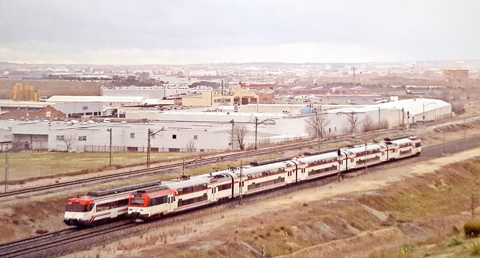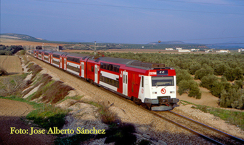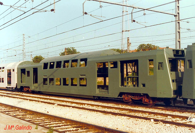 Hemos visto en alguna entrada anterior el apremio que sentía RENFE en los últimos años ochenta por mejorar y ampliar los servicios de cercanías en las grandes ciudades, y muy especialmente en Madrid y Barcelona. Por eso, al mismo tiempo que adquiría un gran número de unidades 446, también apostaba por disponer de composiciones de coches de dos pisos para los recorridos superiores a la media hora de viaje y con gran afluencia de viajeros en los extremos de la línea. En este contexto adquirió en 1987 sesenta coches de viajeros, doce de ellos dotados de cabina de conducción, para, en principio, ser remolcados -o empujados- por locomotoras eléctricas en modalidad "pull-push" formando de este modo doce composiciones de cinco coches siendo uno de ellos el remolque con cabina. En cualquier caso, todo ello sin excluir la posibilidad de la utilización futura de cabezas tractoras específicas. Tras seis años de ser remolcadas este tipo de composiciones por locomotoras Mitsubishi de la series 269-200 y 269-300, las citadas nuevas cabezas motoras se hicieron cargo de ellas y se formaron así en 1994 trenes de cercanías homogéneos y de gran capacidad que quedaron integrados en la nueva serie 450. Además, de forma derivada o complementaria, se constituyó otra familia de similares características pero de menor número de vehículos que fue la serie 451. A ambas series va dedicada esta entrada.