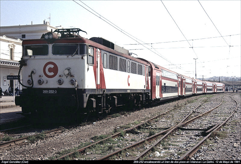 | La 269-252 en cabeza de una típica rama de cinco coches. Vilanova i La Geltrú. Mayo de 1991 (Foto: Ángel González/Forotrenes) |