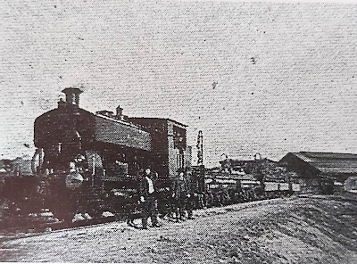 | Una de las locomotoras Andrew Barclay en cabeza de un tren de material para el tendido de la vía (Revista "Ingeniería y Construcción/tomada del libro "El Ferrocarril Santander Mediterráneo) |