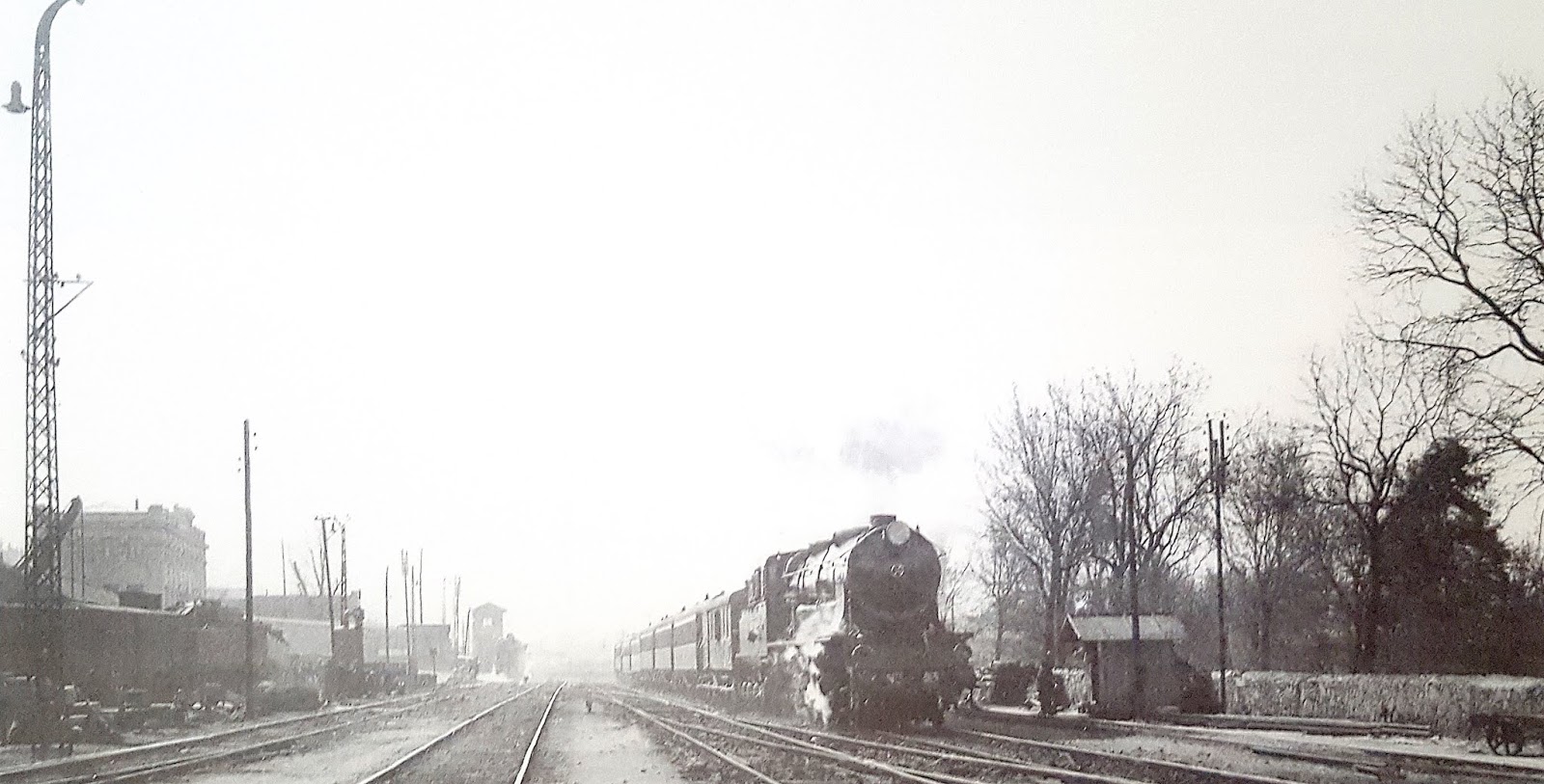 | Una Norte 4600 sale de Príncipe Pío en un día de niebla en cabeza probablemente del rápido Madrid-Irún (Luque) |