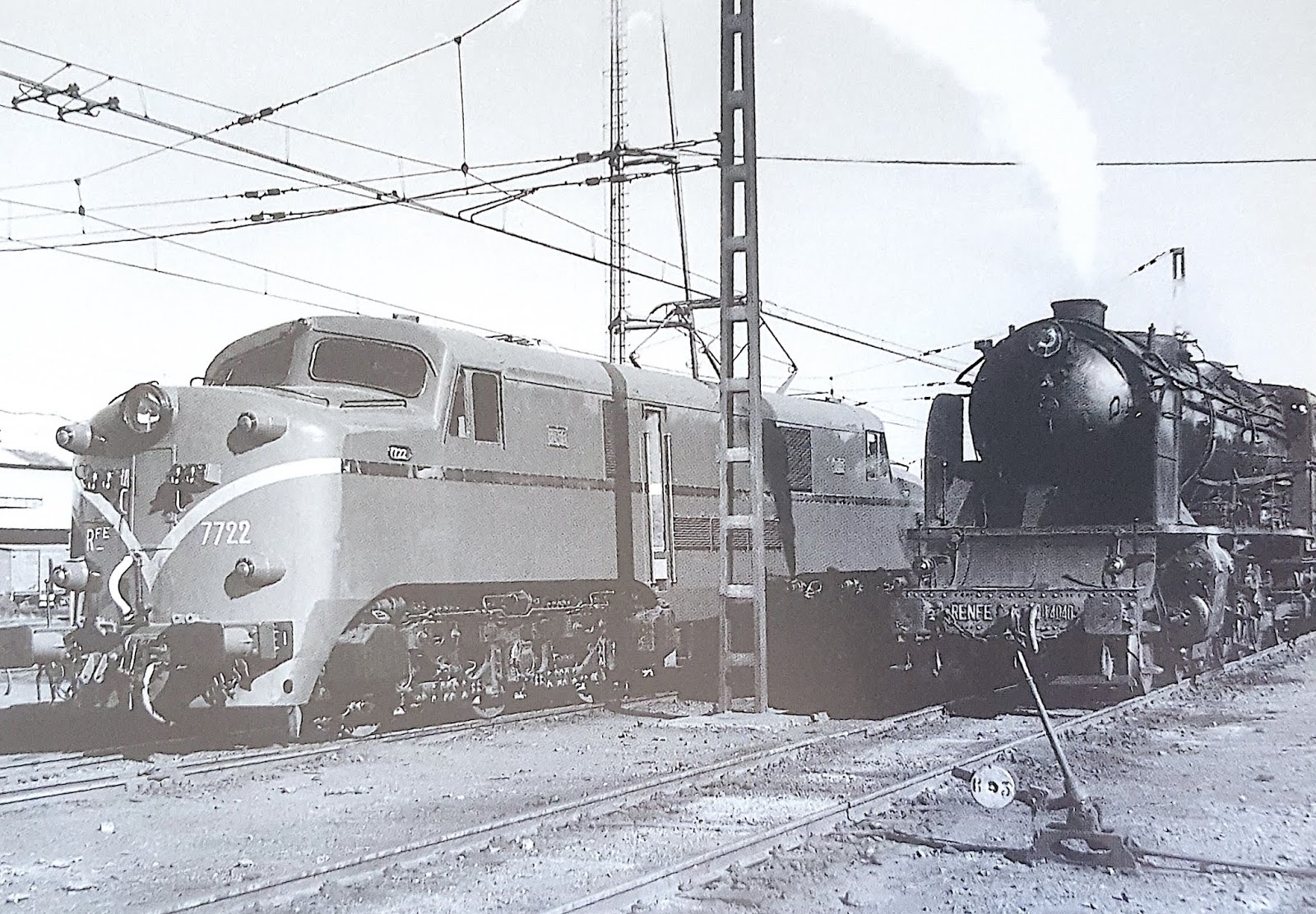 | Probablemente en la misma ocasión que la de la foto anterior, Marshall fotografió a la 241-4040 junto a la eléctrica 7722 encargada de dar tracción desde León hasta otras ciudades del norte a los trenes que habían llegado hasta allí con tracción vapor. |