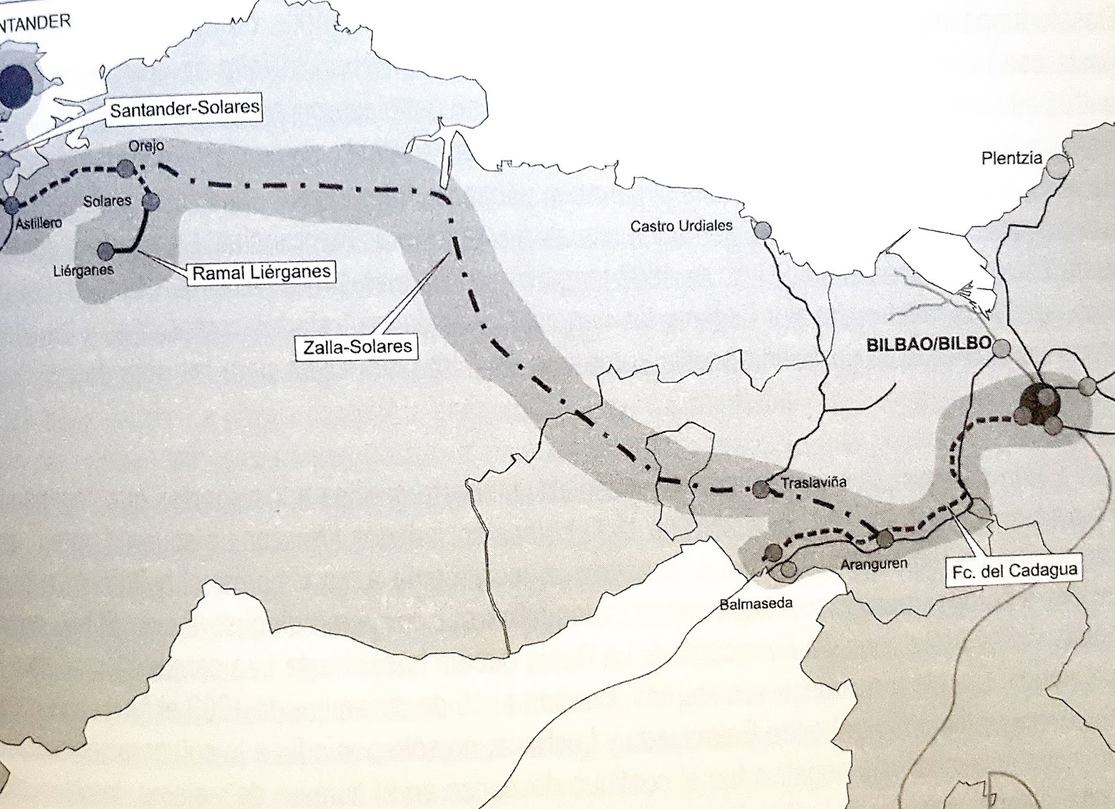 Tras disponer de los recorridos entre Zorroza y Balmaseda y el de Solares a Santander quedaba por ejecutar la línea de unión entre ambos. Finalmente se estableció entre la estación de Zalla en la línea del Cadagua, muy cerca de Aranguren, y Orejo en la línea de Santander a Solares y muy cerca de esta población. En 1893 se constituyó la Compañía del Ferrocarril de Zalla a Solares, como paso previo a su integración al año siguiente en la del Santander a Bilbao. El 6 de junio de 1896 quedó inaugurada esta línea si bien los viajes directos entre ambas capitales sólo pudieron llevarse a cabo desde unos días después, cuando se culminó el cambio de ancho entre Solares y Santander al que me referí más arriba.