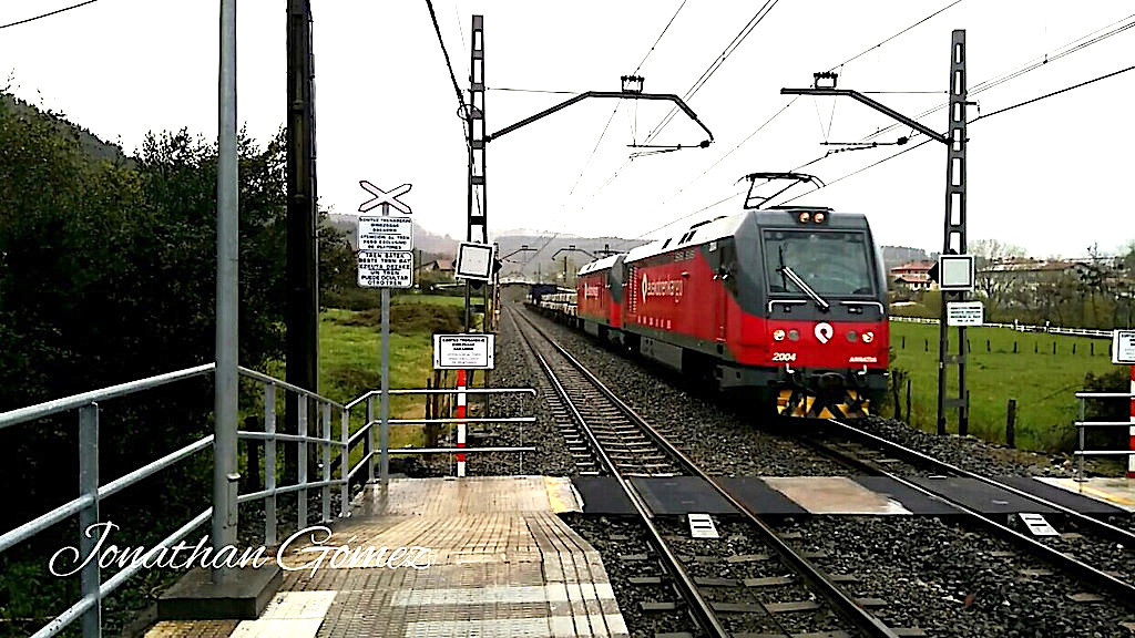 La 2004, de nuevo en doble tracción, en cabeza de un tren de transporte de madera por el polígono industrial de Usurbil (Hodei Goldarazena/Listadotren)
