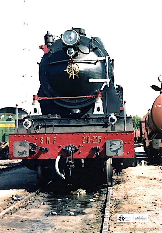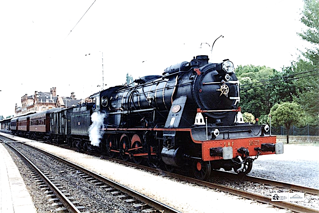 | Aranjuez. La 240-2215 con el anagrama del Servicio Militar de Ferrocarriles (SMF), en cabeza del Tren de la Fresa (AHF/MFM. Colección Octavio Sánchez) |
