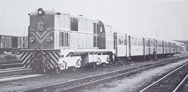 | A la derecha el locotractor MD 1 maniobra para ponerse en cabeza de la composición ya que estos remolques no poseían cabina de conducción (Cortesía de Ramón Capín) |