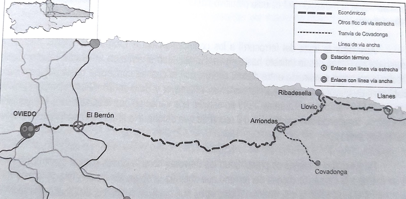 En el último tercio del siglo XIX aparecieron en Asturias algunas iniciativas para unir ferroviariamente Oviedo con lsa comarcas orientales de la región. La que se consolidó fue la que condujo a la creación en Oviedo el 28 de junio de 1887 de la Compañía de los Ferrocarriles Económicos de Asturias Sociedad Anónima con el objetivo de estudiar diferentes posibilidades de establecimiento de ferrocarriles de este tipo en la región y, en su caso, llevar a cabo la obtención de las concesiones de las líneas que se considerasen de interés. Ya el 4 de mayo de 1888, se obtuvo la de Oviedo a Infiesto. Las obras se pusieron muy pronto en marcha y casi desde su principio, se solicitó por algún periódico la continuación de la línea al menos hasta Ribadesella. Se abría así un debate sobre su prolongación hasta unirse con la del Cantábrico -algo que siempre se había contemplado en los planes a un plazo u otro de la compañía- así como sí su tendido debería discurrir por la costa o por el interior.