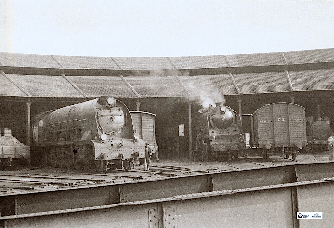 | Gustavo Reder realizó numerosísimas fotos del vapor español pero a veces no es posible saber las fechas en que fueron tomadas. Es el caso de esta imagen -que supongo obtenida en los primeros años cuarenta en el depósito de Madrid-Atocha- de la 241-2104. Es curiosa la inscripción en tiza que figura sobre uno de los topes de la locomotora. Parece que la primera cifra es un "5". A destacar también la veterana que se encuentra en revisión en el foso (AHF/MFM) |
