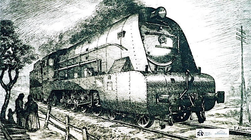 | Este grabado realizado por F. Almuni es un claro reflejo de la impresión que debía causar el imponente aspecto de la 1801 con todo el carenaje original (Archivo Histórico Ferroviario del Museo del Ferrocarril de Madrid (AHF/MFM) |
