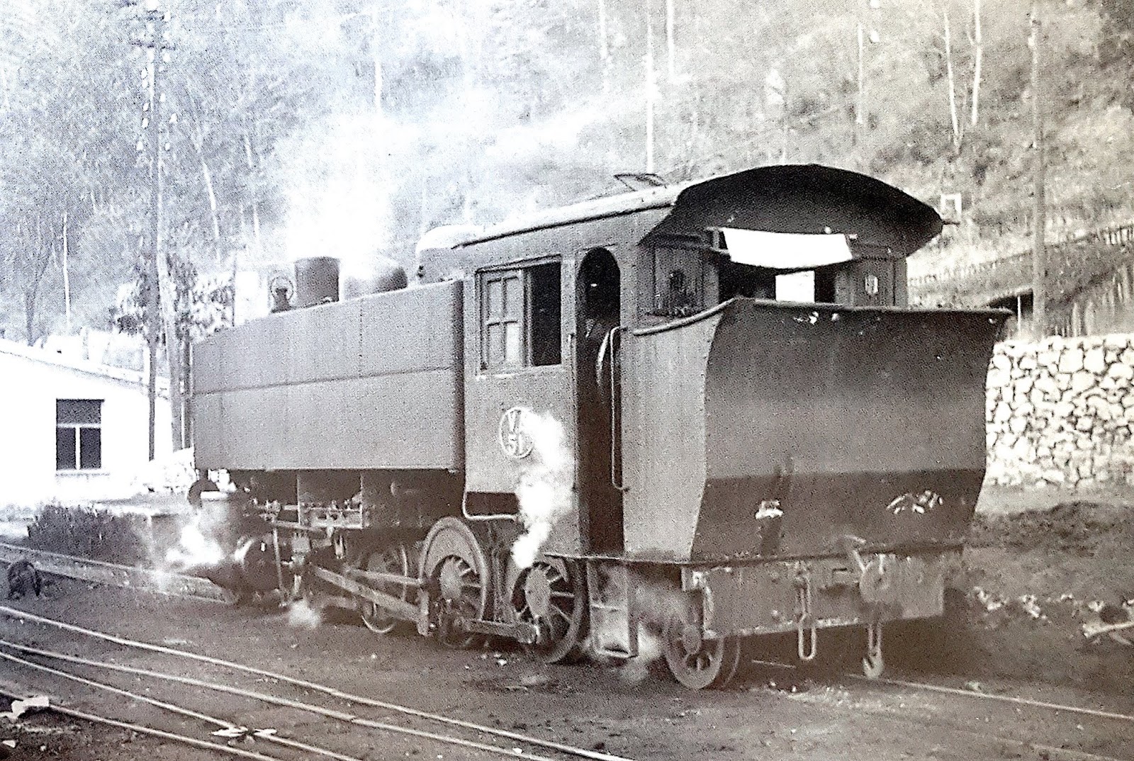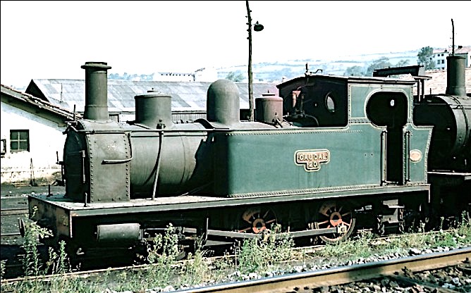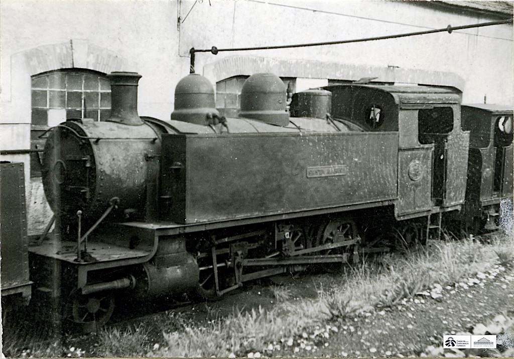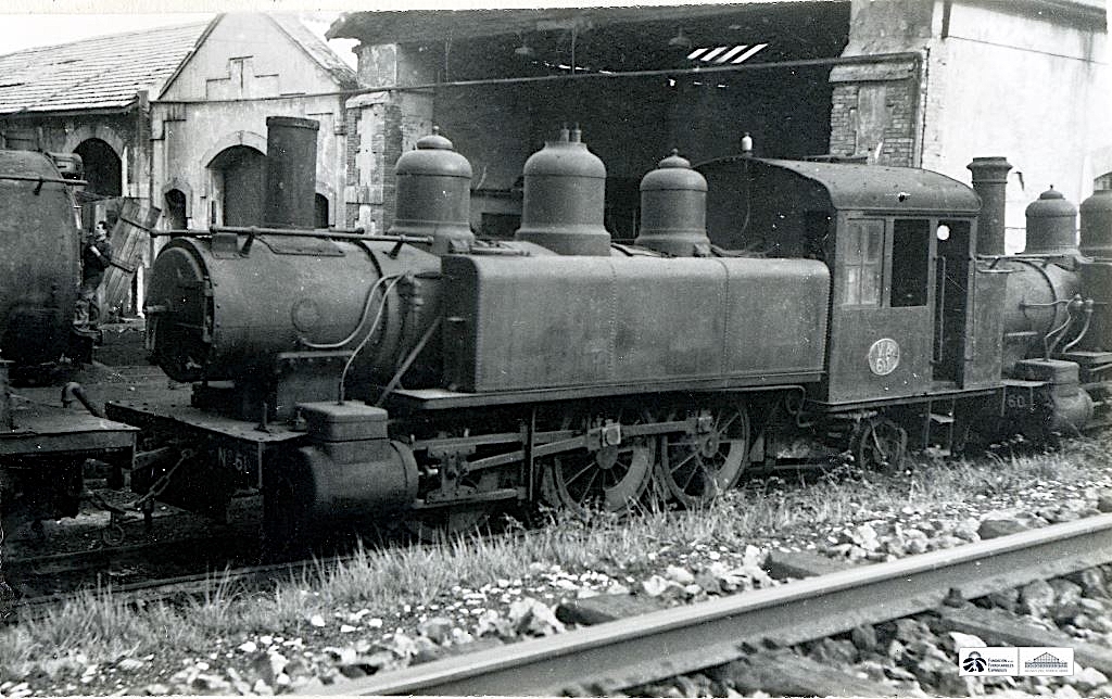 La Babcock&Wilcox nº 8 del Vasco Asturiano, última vaporosa construida en España para vía estrecha, en los talleres de FEVE en El Berrón (autor desconocido)