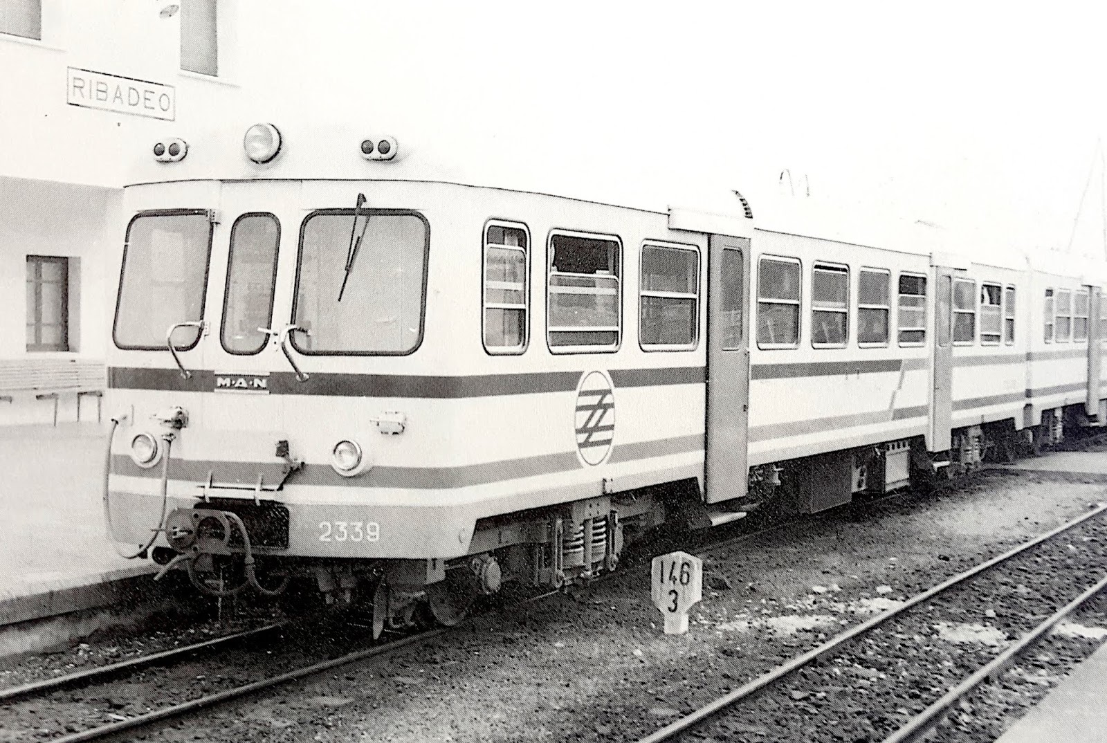 Por lo que se refiere al tráfico de viajeros, la gran revolución que logró que muchas personas volvieran al tren fue la introducción de los automotores MAN en 1967. La acogida fue tan excelente que El Vasco llegó a adquirir hasta veinte coches motores matriculados como 101 a 120, los siete primeros construidos por la propia MAN en Alemania y el resto por Euskalduna bajo licencia. Los catorce primeros llegaron entre 1966 y 1967 y entraron en servicio entre Oviedo y San Esteban de Pravia. En 1968 llegaron tres más destinados al Oviedo a Collanzo junto a otros del primer grupo y en 1970 como refuerzo ante la gran demanda, dos más. De esta forma mejoraron claramente los servicios de viajeros, actividad ésta que se convirtió en la principal de la compañía hasta la integración en FEVE a la que antes me refería y en la que se convirtieron en los 2339 a 2358. Unos excelentes documentos de los primeros servicios de los MAN es esta grabación de Julián de Elejoste restaurada por Gustavo Vieites tomada en la estación de Fuso de la Reina y esta otra del mismo autor siguiendo el recorrido de una composición MAN entre Soto de Ribera y Collanzo.