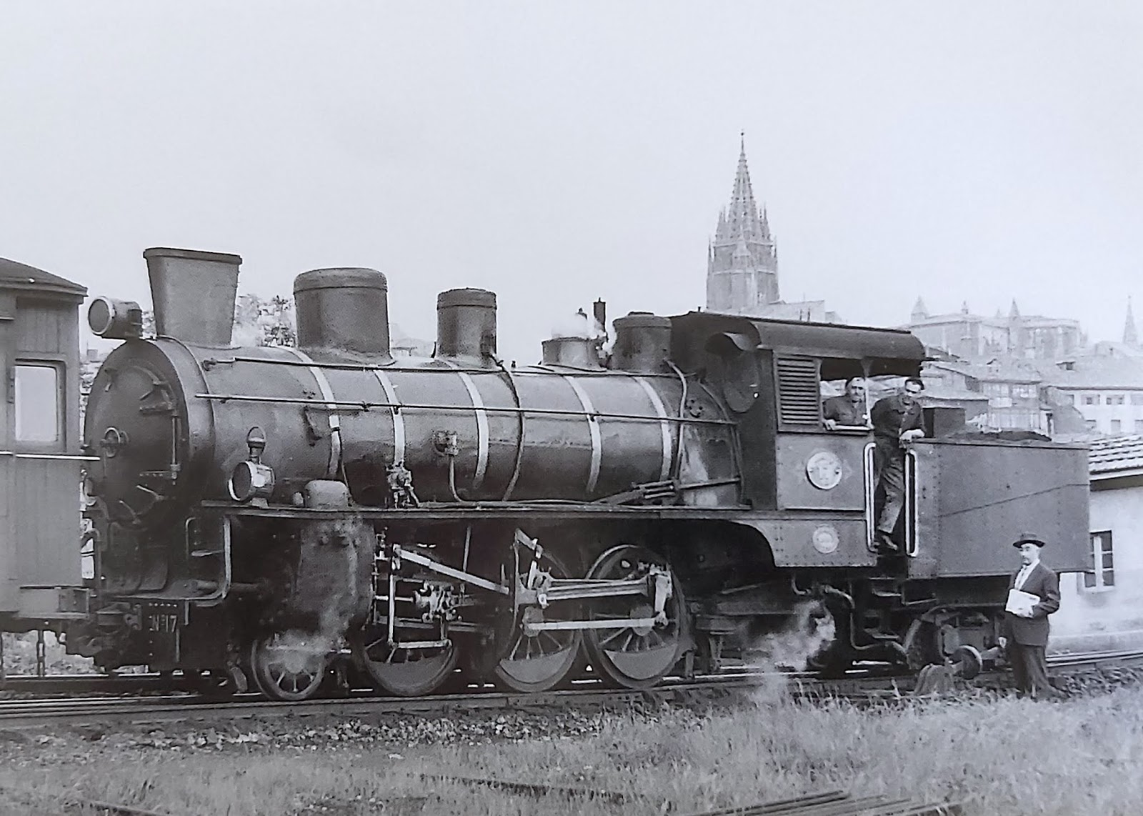 | La 18 en cabeza de su tren en Figaredo. Iba ahora ya dotada del eyector Giesl (autor desconocido/cortesía Eduardo J. Fernández Martinez) |