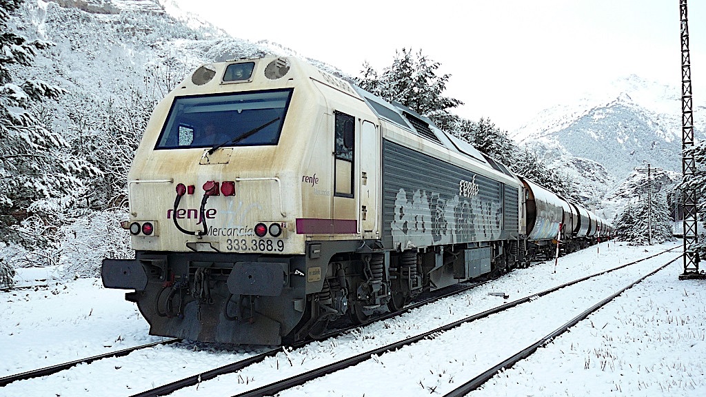 | La 368 saliendo de Canfranc con un cerealero (SNR/Listadotren) |