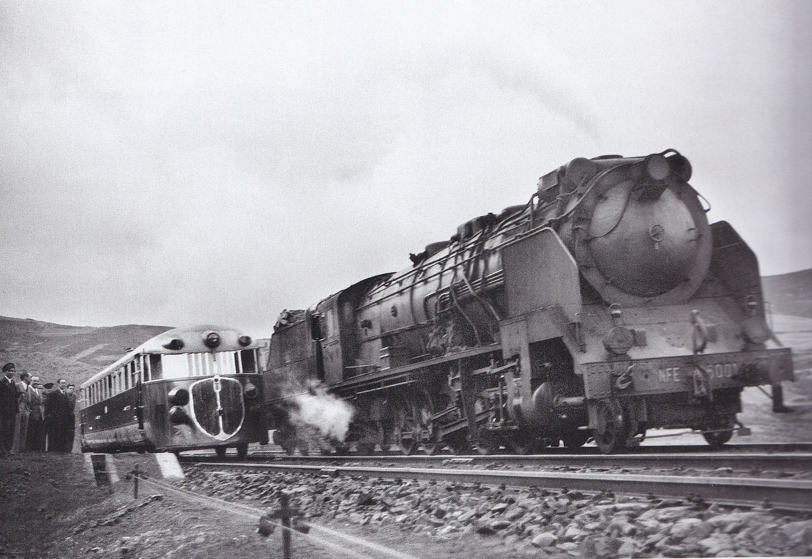 Impresionante frontal de la 5001. Aunque conservaba la numeración de Norte figuraba ya bajo la adscripción de RENFE. Al parecer las cuatro primeras salieron con esta rotulación cambiando en las posteriores a la nueva numeración de RENFE (MTM) El 6 de octubre de ese año de 1942 tuvo lugar su presentación oficial en Barcelona: