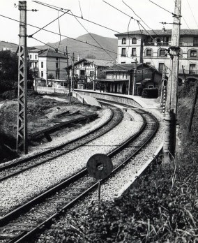 | Vista de la electrificación del ferrocarril de Bilbao a Plentzia en la estación de Neguri. Archivo Euskotren/Museo Vasco del Ferrocarril |