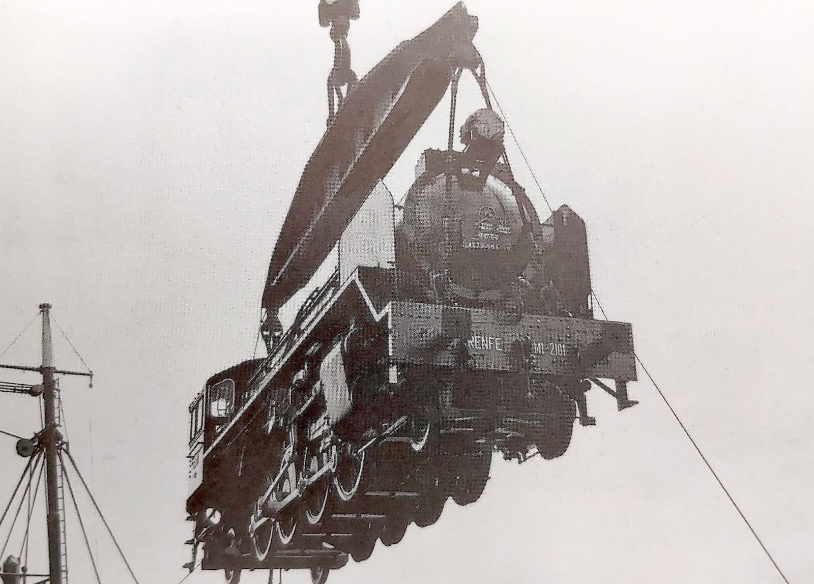 Descarga de la 141-2101, primera de la serie, en el puerto de Bilbao (North British)