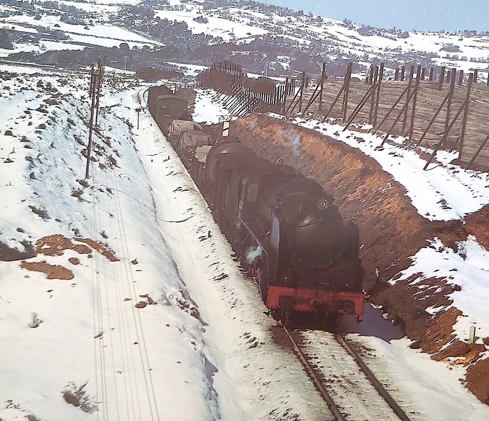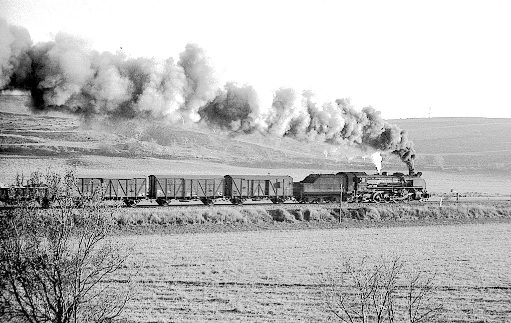 Por aquella zona también arrastraron muchos potaseros. En esta foto de Josep Ferraté de 1970 dos Mikados en doble tracción con uno de estos trenes