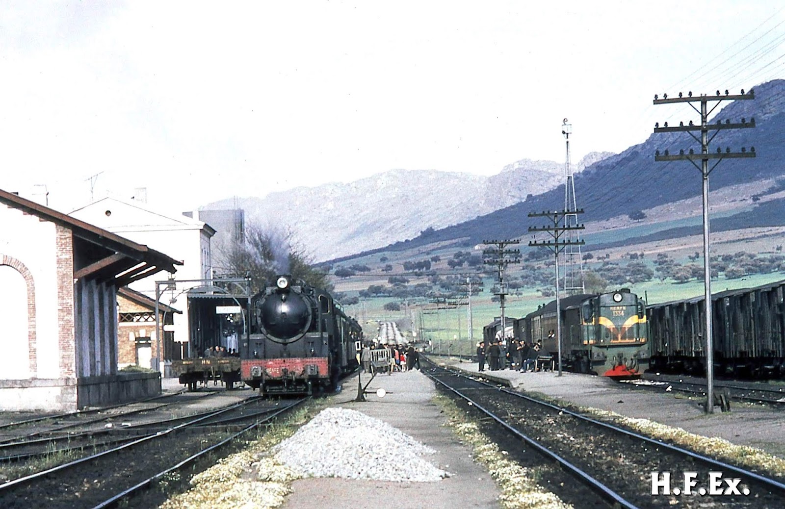 La "maquinista" 141F-2252 en la estación de Almorchón en abril de 1968 con el correo Madrid-Badajoz. A la derecha un tren de la línea Córdoba-Almorchón encabezado por una diésel 1300 (Peter W. Gray/cortesía: Historia del Ferrocarril en Extremadura)