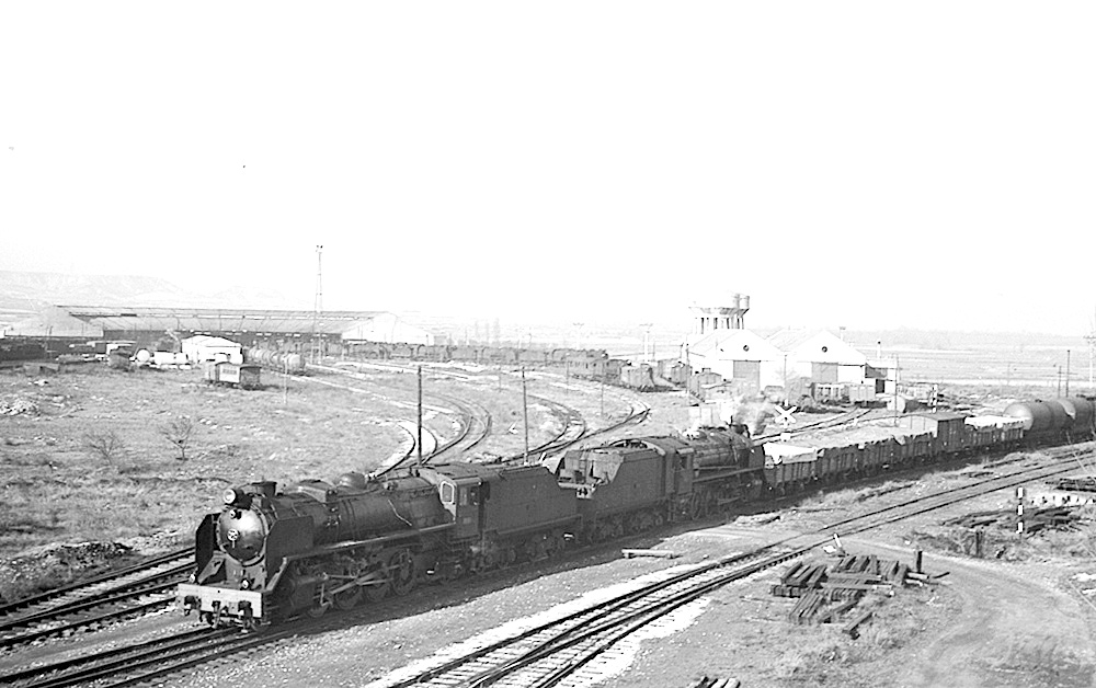Los largos y pesados trenes desde el norte a y desde Madrid hacían necesarias las dobles tracciones en partes de sus recorridos. En esta imagen obtenida por Karl Wyrsch en 1959 en Valladolid una Mikado da la doble a una montaña del antiguo Norte.